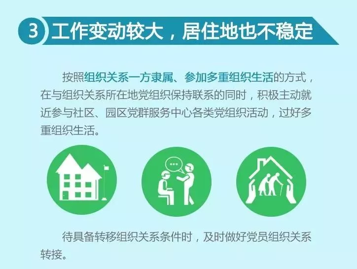 可以將組織關(guān)系轉(zhuǎn)入常駐地或戶(hù)口所在地,在工作變動(dòng)期間,參考《中國(guó)共產(chǎn)黨黨員教育管理工作條例》中流動(dòng)黨員管理辦法,按照組織關(guān)系一方隸屬、參加多重組織生活的方式,在與組織關(guān)系所在地黨組織保持聯(lián)系的同時(shí),積極主動(dòng)就近參與社區(qū)、園區(qū)黨群服務(wù)中心各類(lèi)黨組織活動(dòng),過(guò)好多重組織生活。待具備轉(zhuǎn)移組織關(guān)系條件時(shí),及時(shí)做好黨員組織關(guān)系轉(zhuǎn)接。