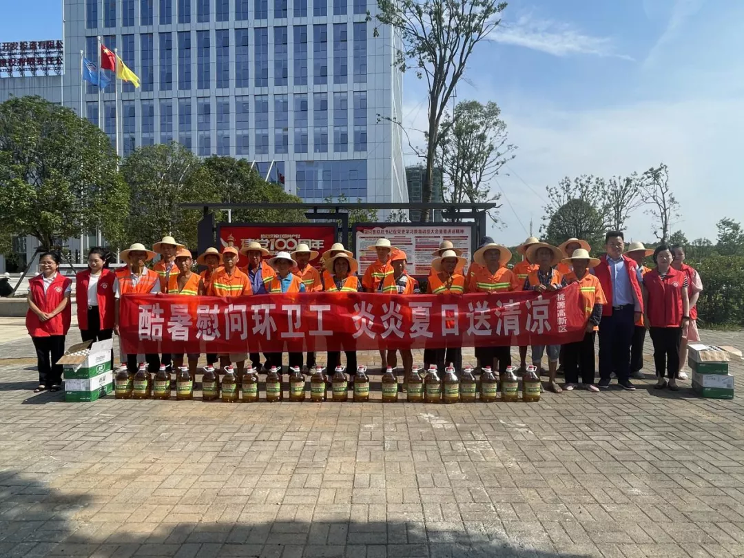 近日,天氣持續(xù)高溫,環(huán)衛(wèi)工人為保障園區(qū)的環(huán)境衛(wèi)生,頂著烈日,堅(jiān)守一線,揮汗如雨,辛勤勞作。7月14日,桃源高新區(qū)黨員志愿者在黨工委委員、管委會(huì)副主任楊新明的帶領(lǐng)下,來到創(chuàng)業(yè)大道、延溪大道、采菱大道等園區(qū)主干道開展“酷暑慰問環(huán)衛(wèi)工,炎炎夏日送清涼”慰問活動(dòng)。