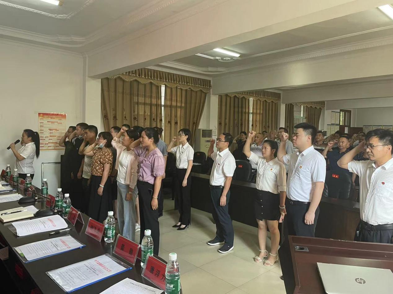 “我志愿加入中國(guó)共產(chǎn)黨,擁護(hù)黨的綱領(lǐng),遵守黨的章程,履行黨員義務(wù)......"鏗鏘誓言回蕩在會(huì)議室,錚錚誓詞讓每一位黨員心潮澎湃、精神振奮。面對(duì)鮮紅的黨旗,全體黨員舉起右拳,莊嚴(yán)宣誓。