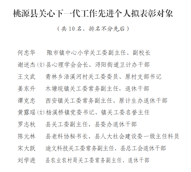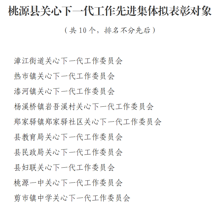 經(jīng)研究,決定將桃源縣關(guān)心下一代工作先進(jìn)集體、先進(jìn)個人擬表彰對象予以公示,征求廣大干部、群眾的意見。現(xiàn)就有關(guān)事項(xiàng)通告如下: