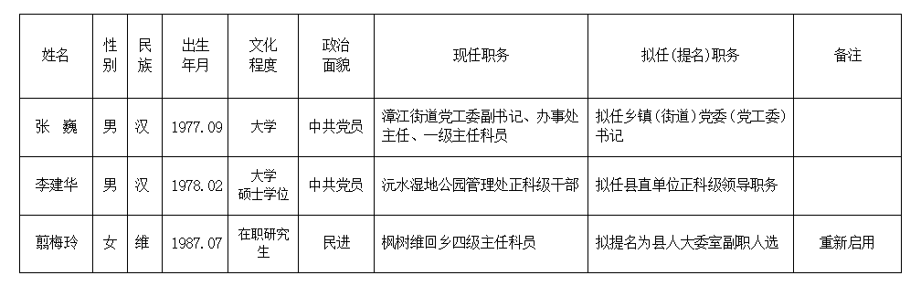 根據(jù)《干部任用條例》及有關(guān)規(guī)定,現(xiàn)對縣委常委會議研究決定的下列擬任職(提名)對象進行任前公示: