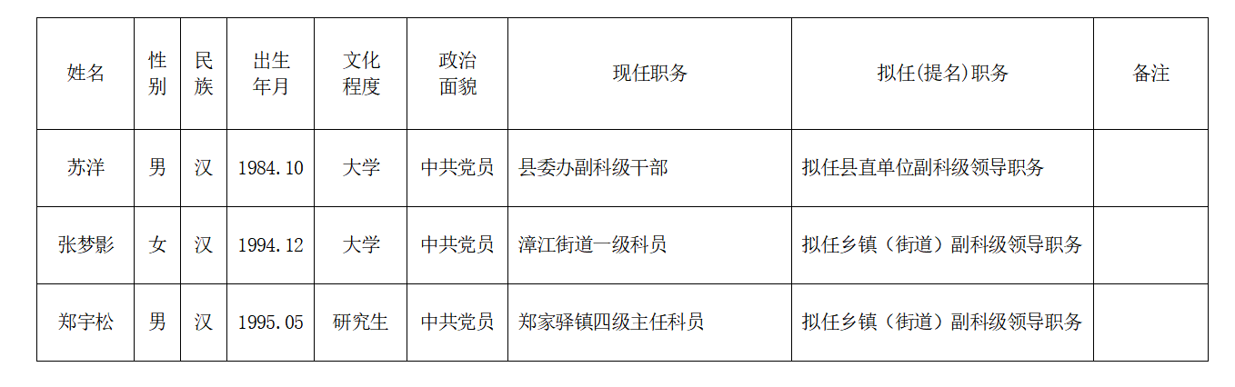 根據(jù)《干部任用條例》及有關(guān)規(guī)定,現(xiàn)對(duì)縣委常委會(huì)議研究決定的下列擬任職(提名)對(duì)象進(jìn)行任前公示: