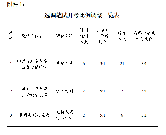 根據(jù)《湖南省公務員公開遴選實施辦法》《湖南省事業(yè)單位公開招聘人員辦法》《桃源縣紀委監(jiān)委2023年公開選調(diào)工作人員的公告》的規(guī)定,經(jīng)縣公務員主管部門、事業(yè)編制人員主管部門批準,選調(diào)工作人員筆試考試開考比例由5:1調(diào)整為3:1。