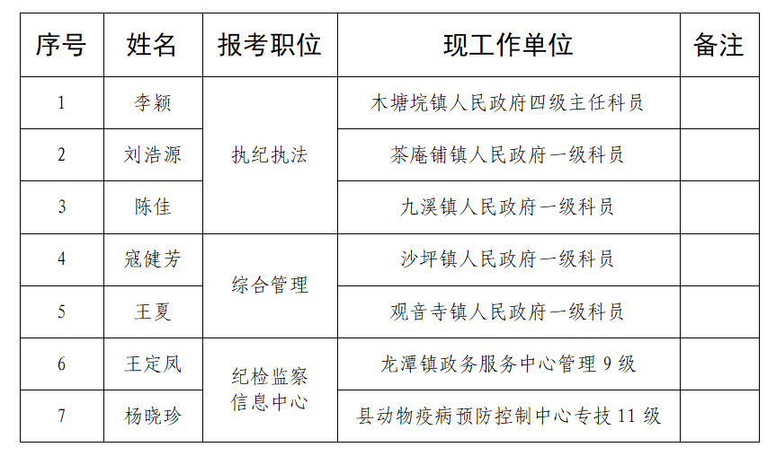 根據(jù)《桃源縣紀(jì)委監(jiān)委2023年公開選調(diào)工作人員的公告》精神,經(jīng)報(bào)名、資格審查、考試、體檢、考察等程序,現(xiàn)確定李穎等7名工作人員為擬試用對象,公示期為2023年10月7日至12日。具體人員名單如下: