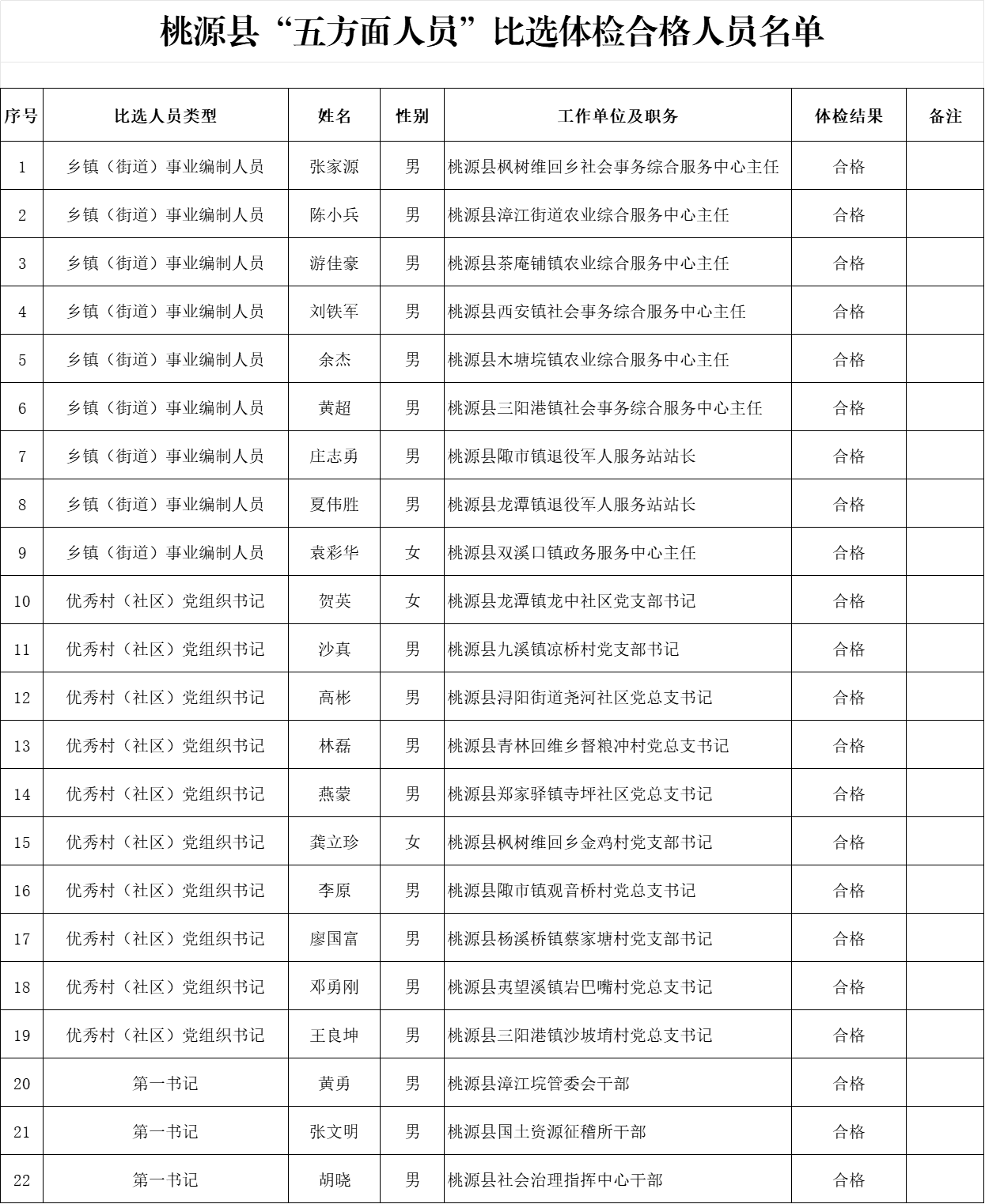 根據(jù)《桃源縣從“五方面人員”中擇優(yōu)選拔鄉(xiāng)鎮(zhèn)(街道)領(lǐng)導(dǎo)班子成員工作的實(shí)施方案》要求,10月24日,桃源縣組織開展了“五方面人員”比選體檢工作,現(xiàn)將體檢合格人員名單予以公示(見附表)。其他需補(bǔ)檢或復(fù)檢的對象擇期體檢后,再公布體檢合格人員名單。