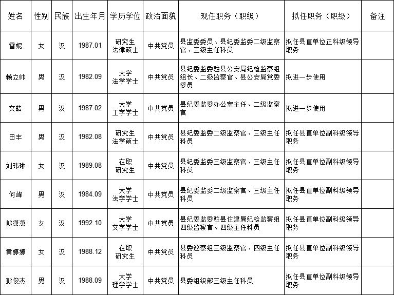 根據(jù)《干部任用條例》及有關(guān)規(guī)定,現(xiàn)對(duì)縣委常委會(huì)會(huì)議研究決定的下列擬任職(提名)對(duì)象進(jìn)行任前公示: