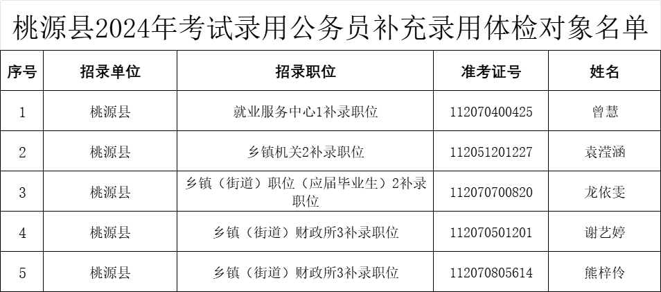 附件:桃源縣2024年考試錄用公務員補充錄用體檢對象名單