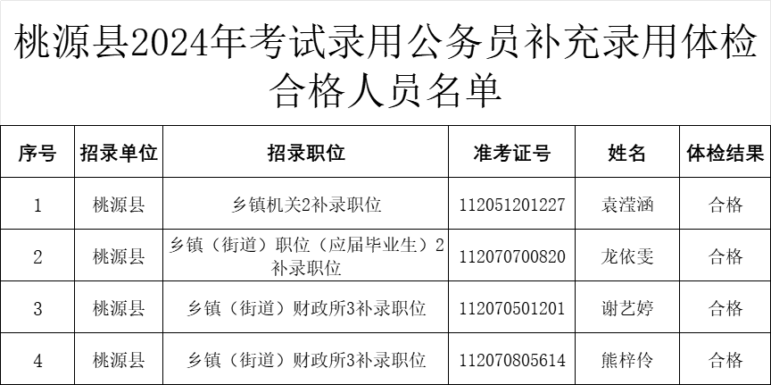根據(jù)《湖南省2024年考試錄用公務(wù)員公告》《湖南省2024年度考試錄用公務(wù)員工作實(shí)施方案》(湘組〔2024〕7號(hào))等文件精神,6月5日,桃源縣組織開(kāi)展了2024年考試錄用公務(wù)員補(bǔ)充錄用體檢工作,經(jīng)體檢醫(yī)院體檢,現(xiàn)將體檢合格人員名單予以公示(見(jiàn)附件)。