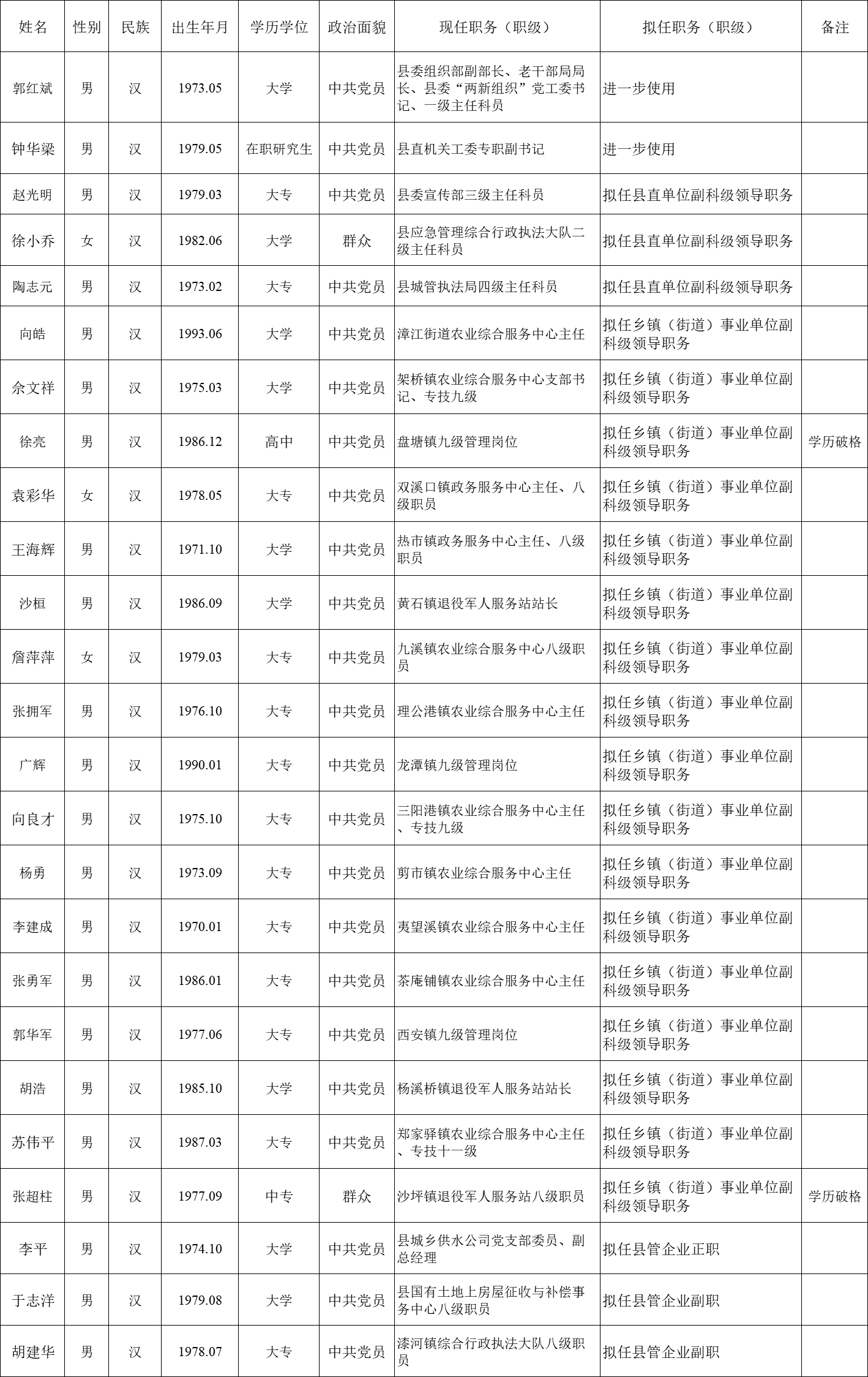 根據(jù)《干部任用條例》及有關(guān)規(guī)定,現(xiàn)對縣委常委會會議研究決定的下列擬任職(提名)對象進行任前公示: