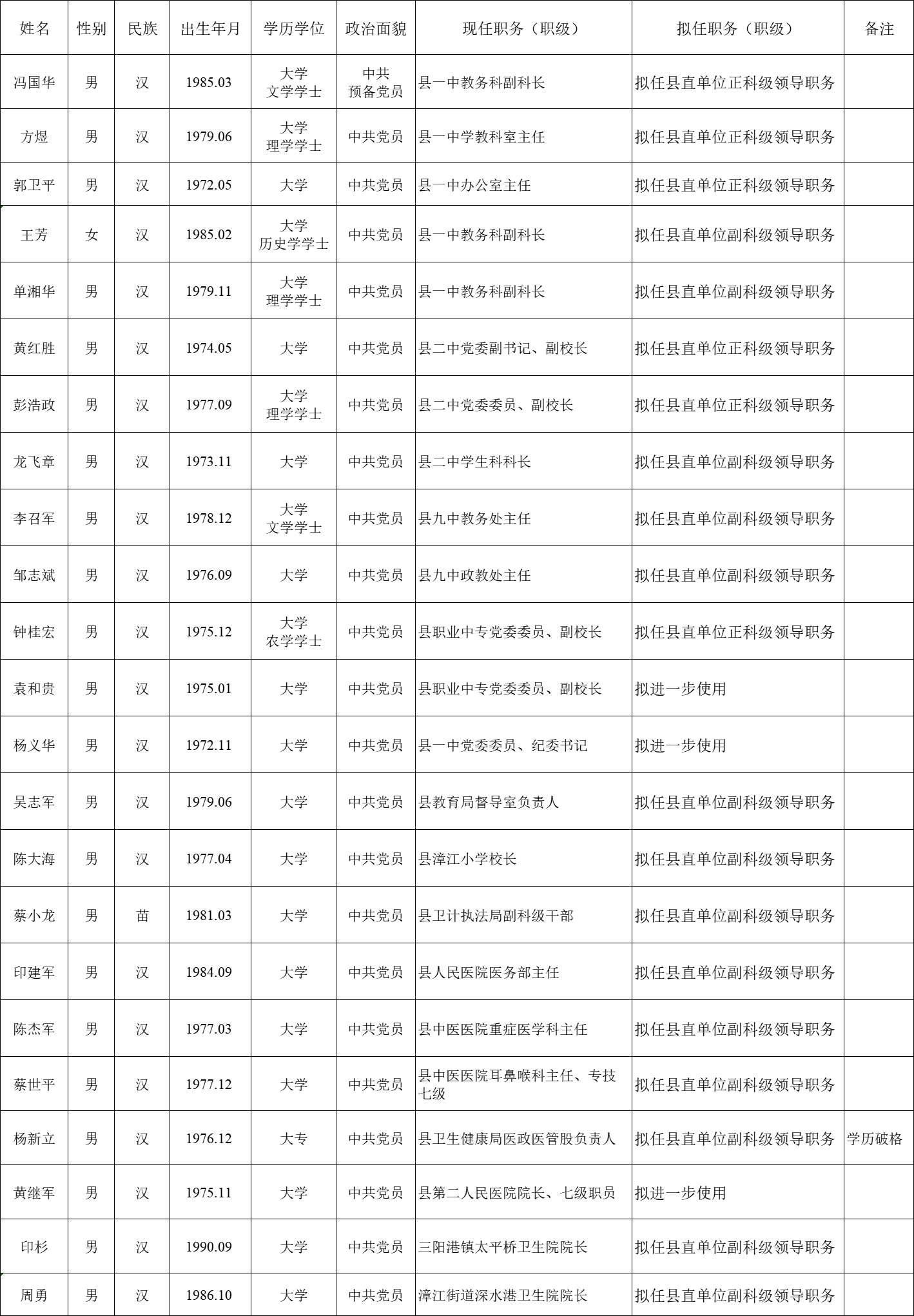 根據(jù)《干部任用條例》及有關(guān)規(guī)定,現(xiàn)對縣委常委會會議研究決定的下列擬任職(提名)對象進(jìn)行任前公示: